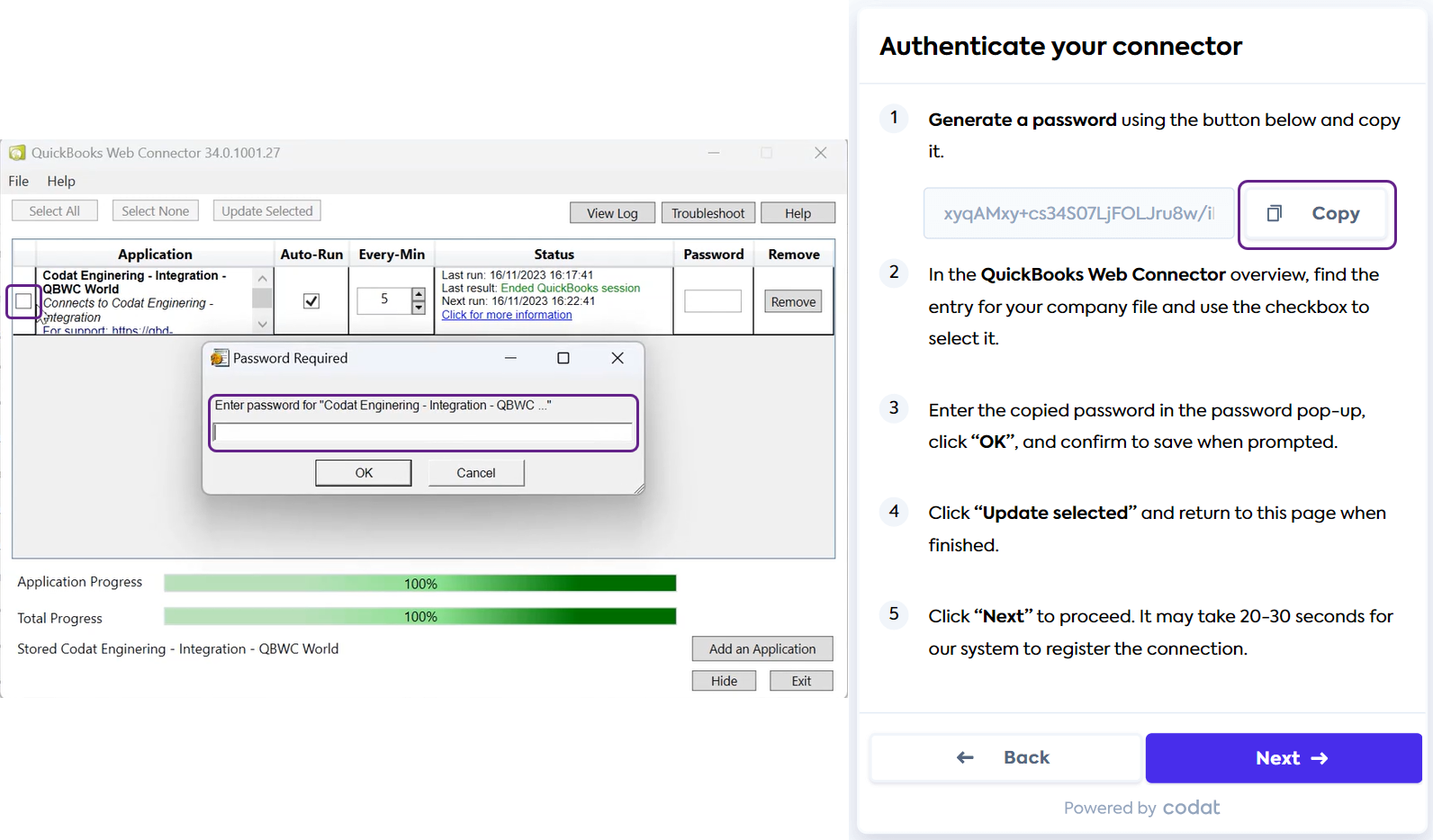 Once the password is saved, access to QuickBooks will be granted and the connector will process the datasets you have chosen to fetch on first linkLink The authorization flow that allows end users to connect their accounting, banking, or commerce platforms to your application via Codat. (see Data Sync Settings).